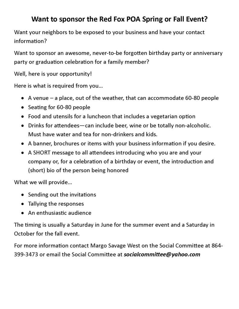 Want to sponsor the Red Fox POA Spring or Fall Event?